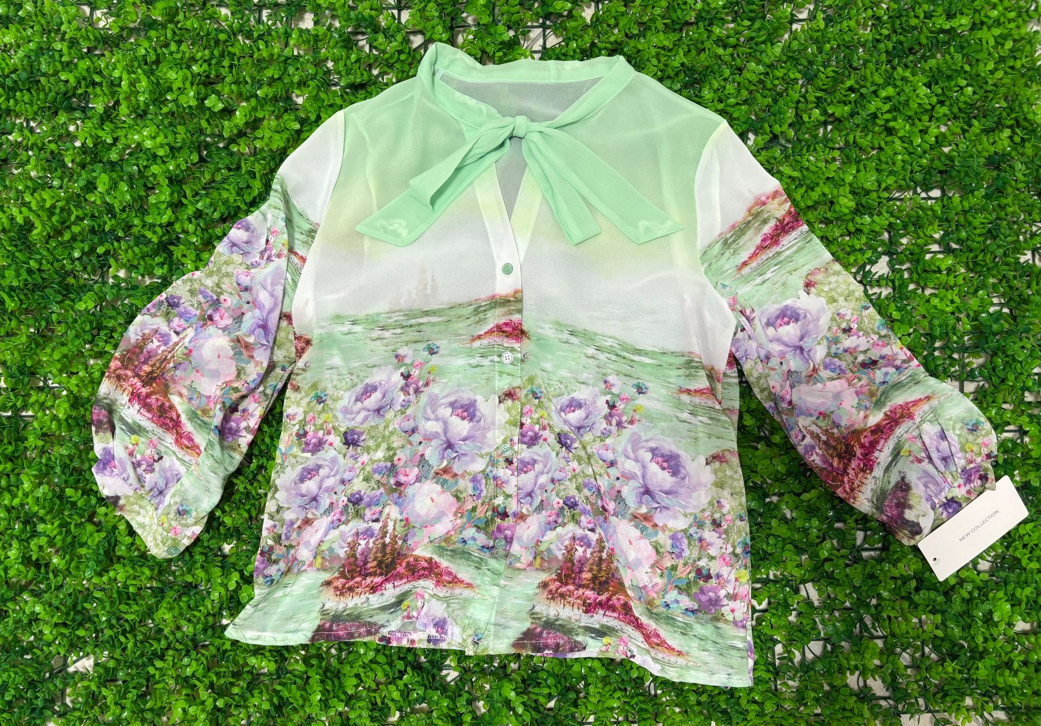 Realizzata in un tessuto impalpabile che accarezza la pelle, presenta una magnifica fantasia floreale che mescola armoniosamente tonalità di verde acquamarina, lilla pastello e tocchi di rosa e fucsia, creando un effetto pittorico e raffinato. Le maniche lunghe, con una leggera morbidezza, e la vestibilità fluida la rendono ideale per ogni silhouette.