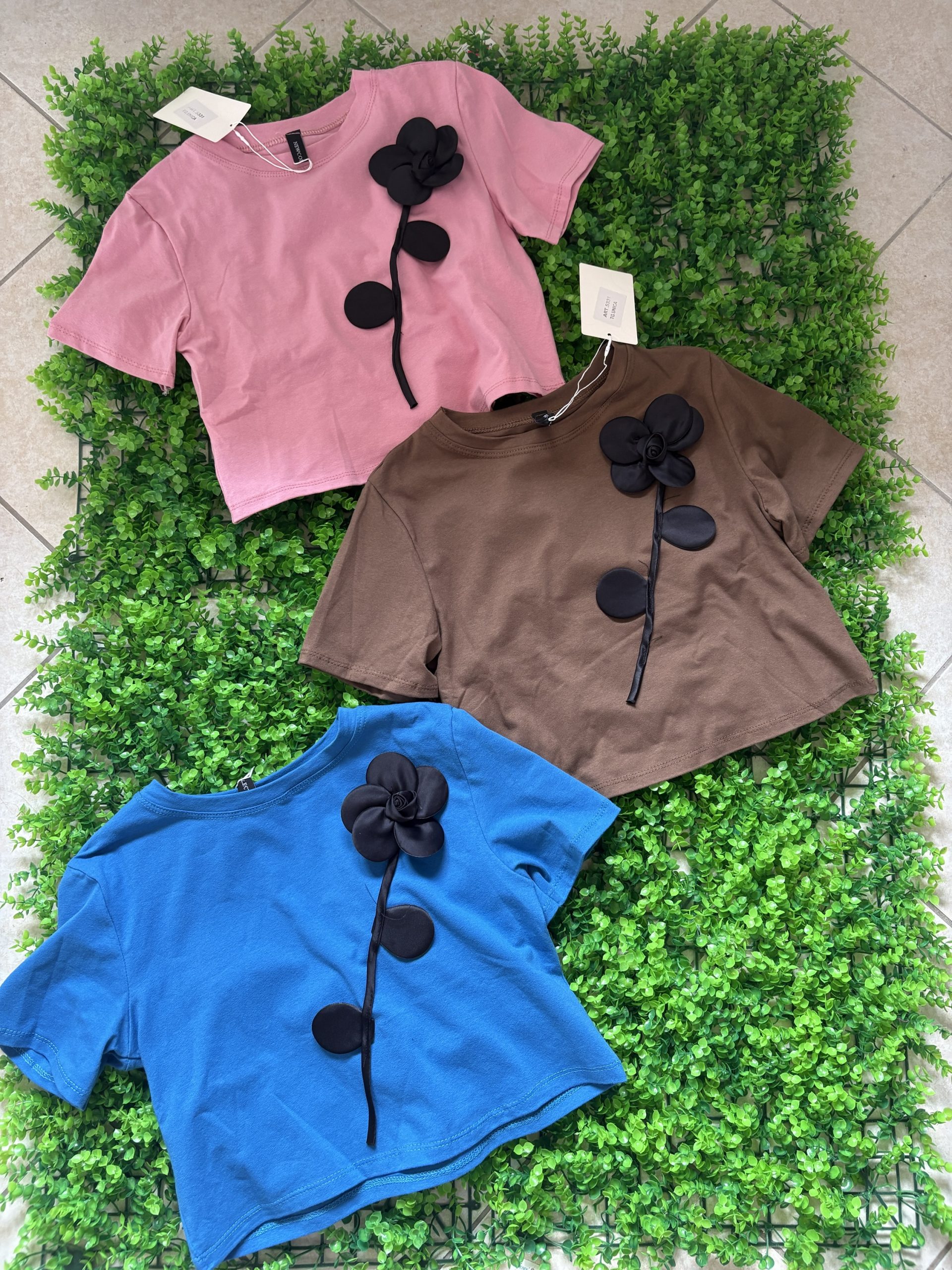 T-shirt corta dal taglio moderno in tonalità vivaci, caratterizzata da un’elegante applicazione floreale nera in rilievo sul davanti. Realizzata in tessuto morbido e leggero, offre una vestibilità confortevole e versatile, perfetta per outfit casual chic. Il design crop valorizza il punto vita, ideale da abbinare a jeans o shorts per un look fresco e alla moda.