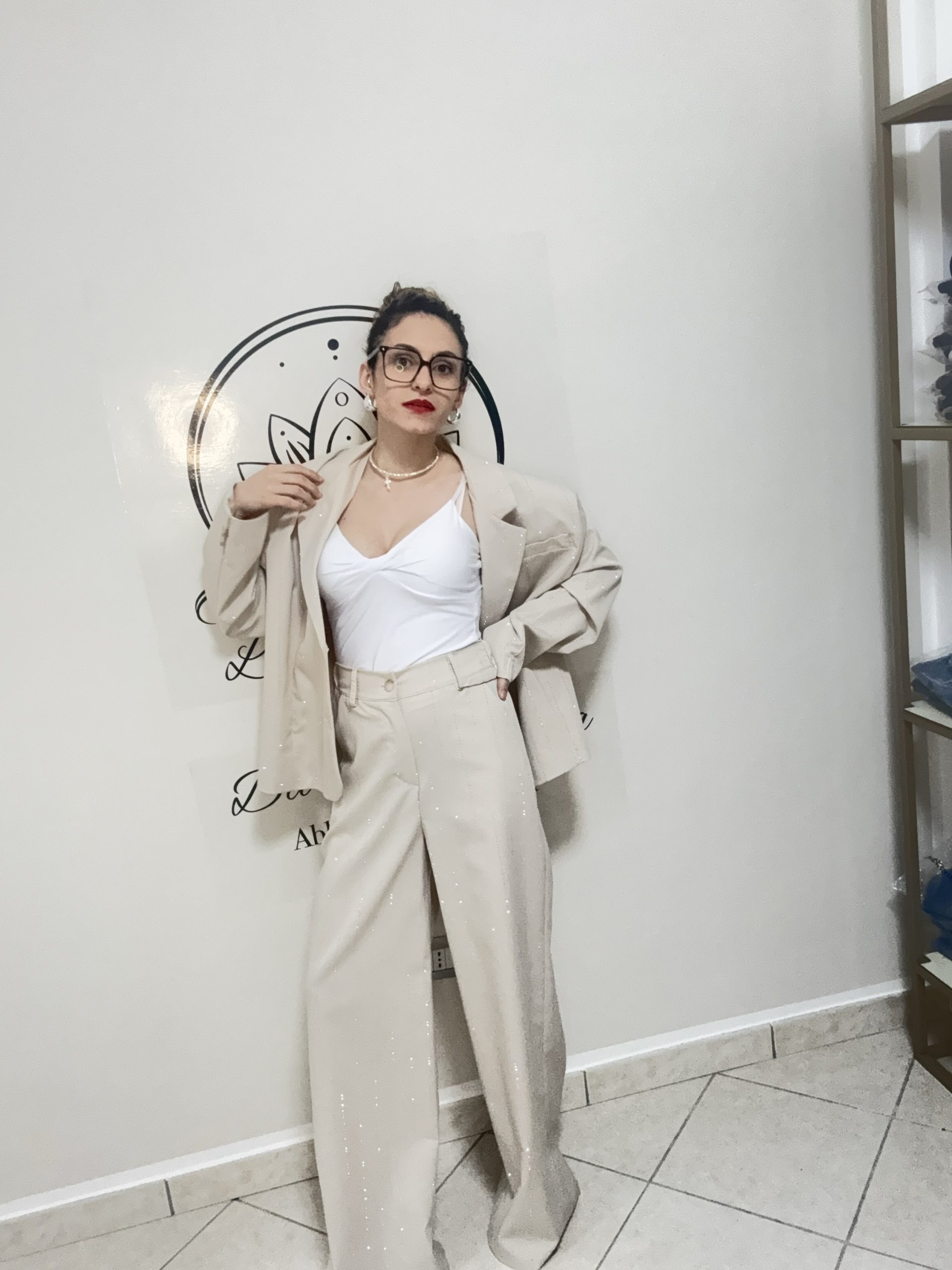 Talleur con brillanti, comodo, elegante e sempre alla moda nella sua semplicità, pantalone a zampa e giacca comoda